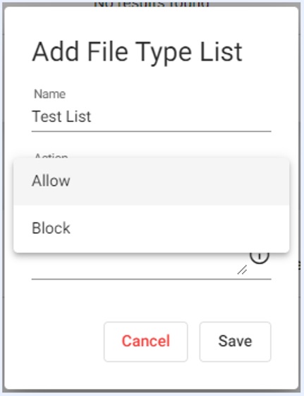 ファイルタイプ制限のリストは、許可またはブロックすることができます。