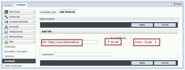「SSL | Incidents | Add Website」(SSL | インシデント | Webサイトの追加)に移動します。RBI URL shield.ericomcloud.net. を追加します。By URL(URL を使用)を選択します。「Action」(アクション)を「Tunnel」に設定し、「Apply」(適用)をクリックします。