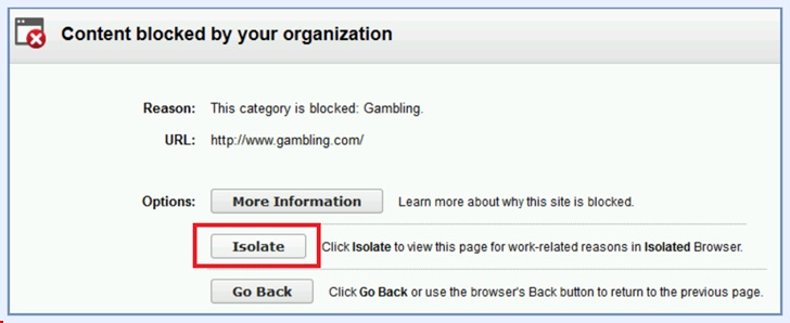 これにより、確認に設定したサイトにユーザがアクセスすると、「Continue」(続行)ボタンが「Isolate」(分離)ボタンに置き換えられます。