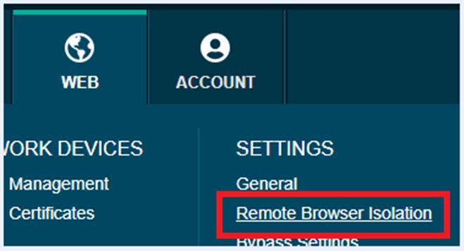 「Web | Settings | Remote Browser Isolation」(Web | 設定 | リモートブラウザ分離)でリモートブラウザ分離の設定を構成します。