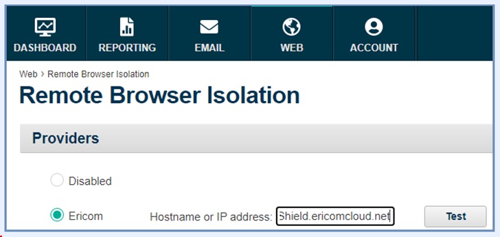 「Test」ボタンを押して、Shield Cloud への接続を確認します。接続に成功すると、Ericom Shield のログインページが表示されます。