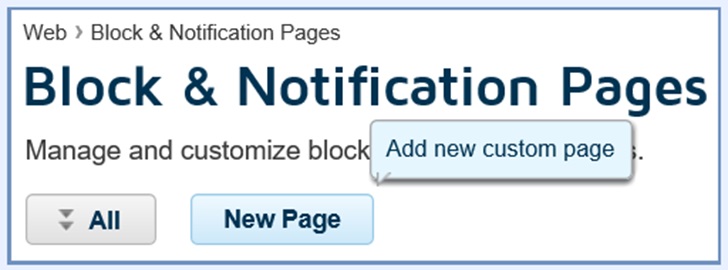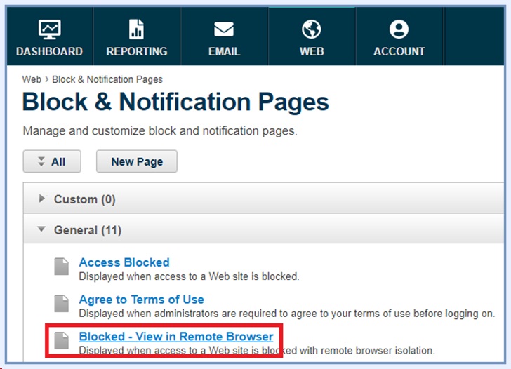 エンドユーザにブロックページを表示する必要がなく、Web リクエストが自動的にブラウザ分離に移動する必要がある場合は、カスタムページを作成することでこれを実現できます。カスタムページを作成するには、「Block & Notification Pages」(ブロックと通知のページ)画面で「New Page」(新しいページ)ボタンをクリックします。