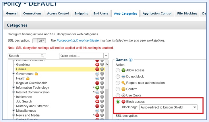 Ericom Shieldは、Block Page Redirect を介して Forcepoint Web Security(オンプレミス)と通信し、アイソレーションベースのゼロデイマルウェア保護を提供します。Forcepoint Web Security Gateway のブロックページの Continue ボタンを設定し、Ericom Shield にウェブサイトを送信する方法は以下をご覧ください。