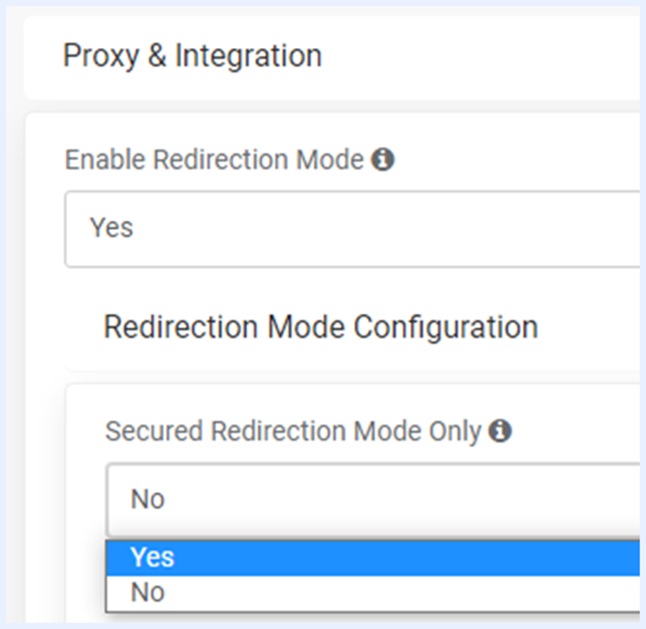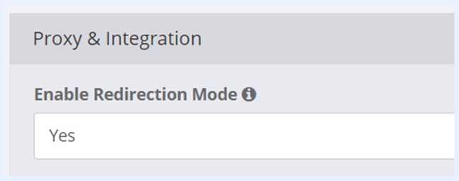 さらに、Redirection Mode(リダイレクトモード)を有効にします。管理コンソールの「設定 | プロキシ & インテグレーション」に移動して、「リダイレクトモードを有効にする」を「Yes」にします。次に、以下の設定を行います: