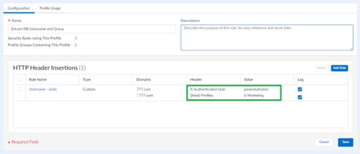 レポートのためにユーザ名を Shield セッションに追加するには、次のパラメータを追加します: &user=_USERNAME_[uriescape]