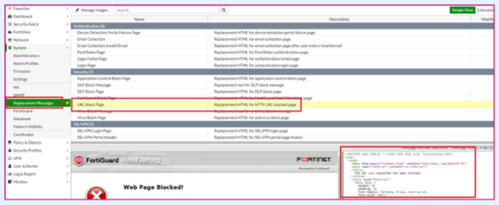 FortiGateでブロックページを編集するには、「システム|交換メッセージ」に進みます。