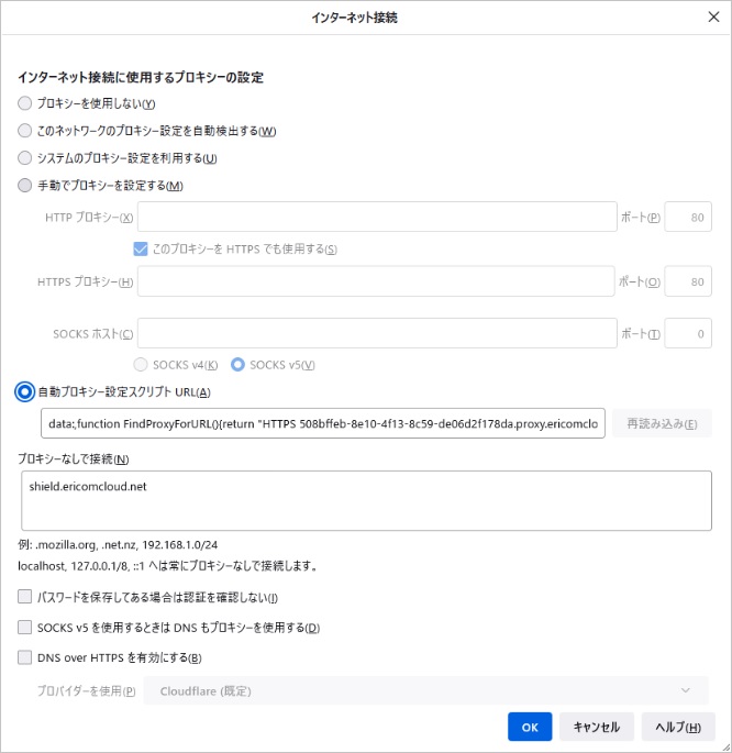 ※ SAML認証している場合、Shield CloudはユーザーのSAML認証のために「shield.ericomcloud.net」を経由してSAML認証サイトへ遷移します。そのため、「プロキシーなしで接続」には、「shield.ericomclooud.net」を設定する必要があります。