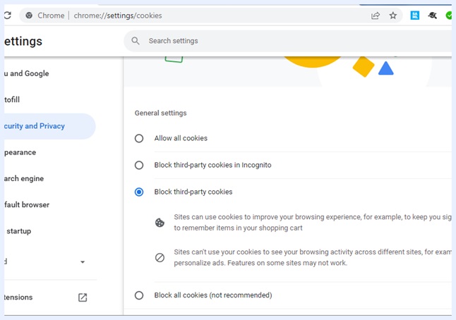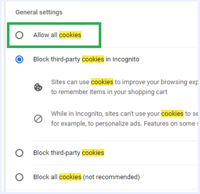 解決方法:Google Chromeで「すべてのCookieを許可する」に設定する(設定|プライバシーとセキュリティ|Cookieとその他のサイトデータ|一般設定)