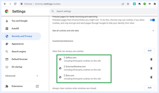 Office 365に単独でログインするには、これらのサイトへのCookieを許可する必要があります。