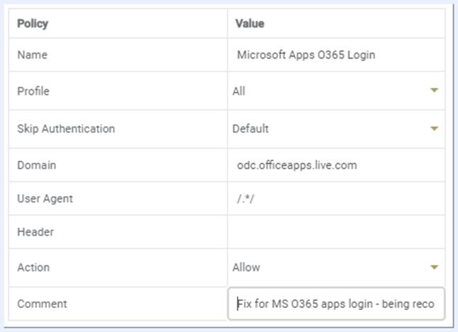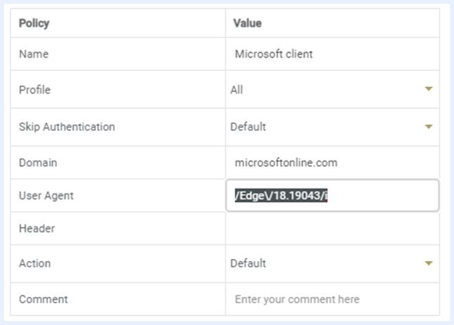 Microsoft O365アプリケーションを使用する場合、サインインプロセスで埋め込みブラウザを使用することがあります。 この通信が分離され、ユーザーのログインがブロックされている可能性があります。 これを解決するには、アプリケーションのユーザーエージェントにアプリケーションポリシーを追加します。