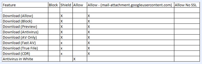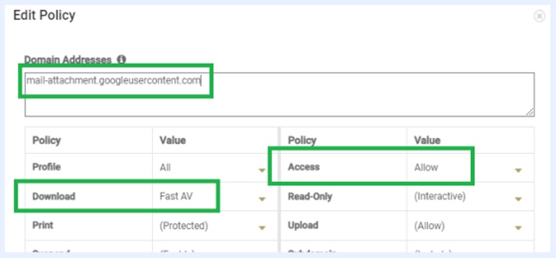 Access = Allowモードでは、Gmailファイルドメインのみが「ダウンロード」オプションでサポートされます。Allowモードで他のすべてのドメインのファイルスキャンを行うには、「Antivirus in White」オプションが必要です。