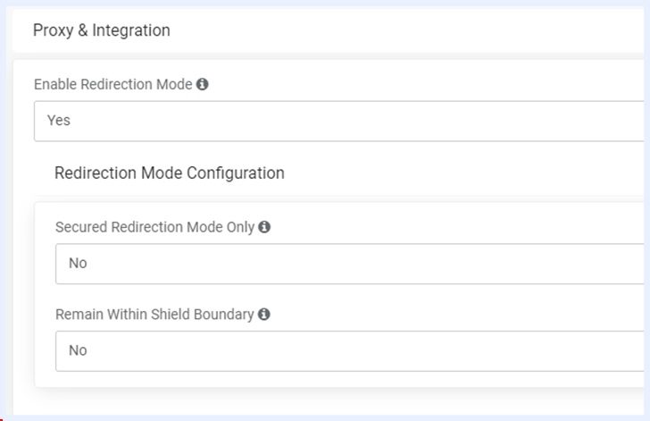 さらに、Redirection Mode(リダイレクトモード)を有効にします。管理コンソールの「設定 | プロキシ & インテグレーション」に移動して、「リダイレクトモードを有効にする」を「Yes」にします。次に、以下の設定を行います:
