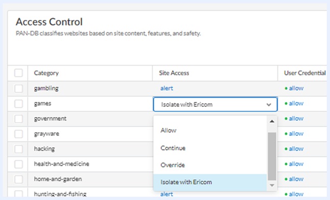 Ericom Browserの分離を使用するために必要なカテゴリを設定します。