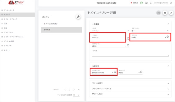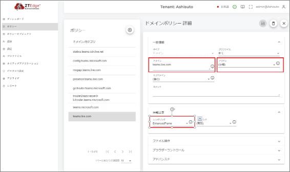 VMIを利用するために、Ericom Shield Cloud管理コンソールにおいて各Webシステムのドメインポリシーを追加し、そのポリシーのレンダリング設定を「EnhancedFrame」へ変更します。