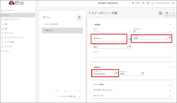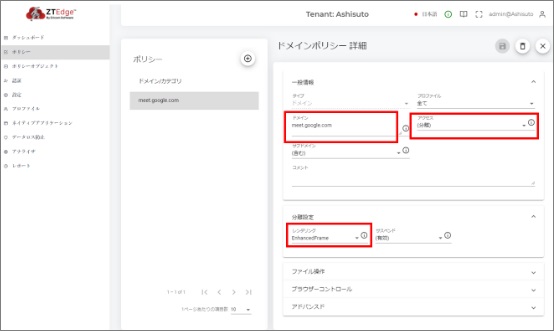 Zoomの場合以下のとおり、ドメインポリシーを追加します。ドメイン:zoom.usアクセス:分離レンダリング:EnhancedFrameMeetの場合以下のとおり、ドメインポリシーを追加します。ドメイン:meet.google.comアクセス:分離レンダリング:EnhancedFrameTeamsの場合以下のとおり、ドメインポリシーを追加します。ドメイン:teams.live.comアクセス:分離レンダリング:EnhancedFrameWebExの場合以下のとおり、ドメインポリシーを追加します。ドメイン:webex.comアクセス:分離レンダリング:EnhancedFrame