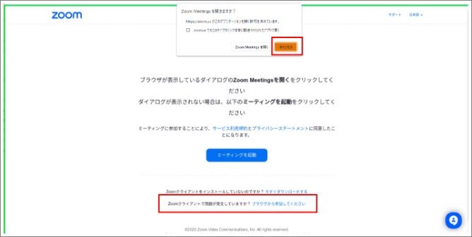 もし「ブラウザから参加してください。」のリンクが表示されていない場合は、一度画面上の青色の「ミーティングを起動」をクリックしてみてください。これにより、再びポップアップが表示されるとともに、「ブラウザから参加してください。」のリンクが表示されます。