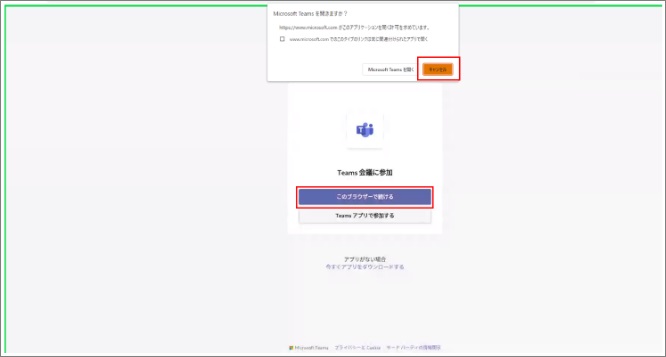 下記はTeams会議を起動する画面です。通常、下記の通り「Microsoft Teamsを開きますか?」というポップアップが表示されますが、こちらはキャンセルした上で 「このブラウザーで続ける。」のリンクをクリック してください。これにより、ブラウザからVMIを介したTeams会議を起動、参加が可能となります。
