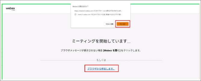下記はWebEx会議を起動する画面です。通常、下記の通り「Webexを開きますか?」というポップアップが表示されますが、こちらはキャンセルした上で 「ブラウザから参加します。」のリンクをクリック してください。これにより、ブラウザからVMIを介したwebEx会議を起動、参加が可能となります。