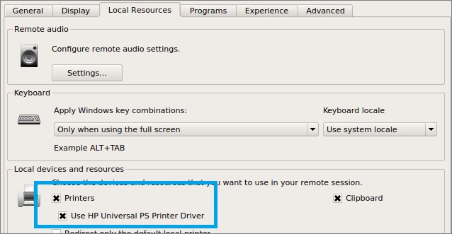 印刷を有効にするには、ローカルリソース・タブをクリックし、「Printers」と「Use HP Universal PS Printer Driver」をオンにします。