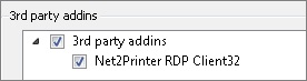3rd party addins…(サード・パーティのアドイン) - サード・パーティ RDP アドインを有効にします(例: 汎用ドライバ印刷のリダイレクト対応)。 サード・パーティ・アドインのビット・レベルは、Blaze クライアントのビット・レベルと一致する必要があります。例えば、x64 ベースのサード・パーティ・コンポーネントがインストールされている場合、x64 Blaze クライアントとともに使用する必要があります。 ビット・レベルを混在することはできません。混在している場合、サード・パーティのコンポーネントはアドインの一覧に表示されません。