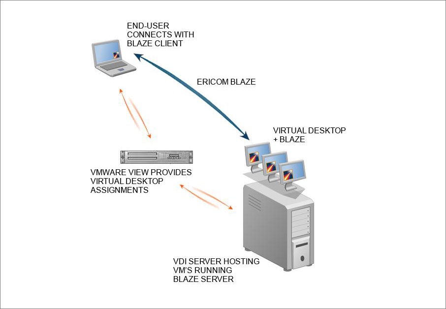 Ericom Blaze クライアントは、VMware View 5.2 および 5.3 の接続ブローカーをサポートしています。 Ericom Blaze は、認証のために View ブローカーを使用した後、目的の仮想デスクトップに直接接続します。 VMware View アクセス用に Ericom Blaze RDP Acceleration を使用する場合、View クライアントの代わりに Blaze クライアントが使用されます。 Blaze クライアントには View クライアントは必要とされず、View クライアントを置き換える必要もありません。