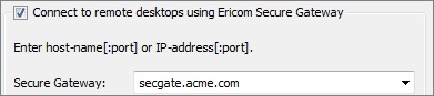 Ericom Secure Gateway を使用する場合 - Connect using Ericom Secure Gateway チェックボックスをオンにします。 Ericom Secure Gateway サーバのアドレスを入力します。 ポートを明示的に指定しない場合、デフォルトの 443 が使用されます。 ポートを指定するには、以下の記入例のように「:」を入力し、アドレスの後にポート値を入力します。 上記の例では、Secure Gateway のアドレスは secgate.acme.com です。ポートの指定がないため、443 が自動的に使用されます。