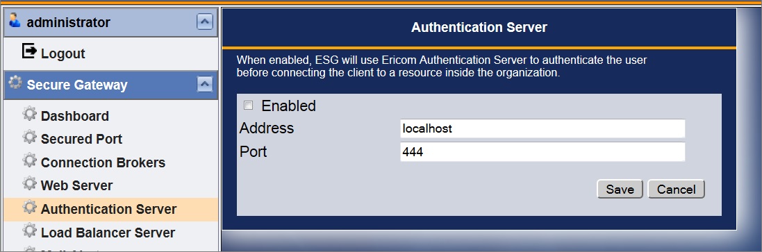 Ericom Secure Gateway には、認証サーバが備えられています。認証サーバにより、エンド・ユーザが内部リソース(ターミナル・サーバ、AccessNow サーバなど)にコンタクトする前に認証を行うセキュリティ・レイヤーが提供されます。 認証サーバは、主にスタンドアロン・クライアントとともに使用され、PowerTerm WebConnect および VMware View コネクション・ブローカーとは使用されません。