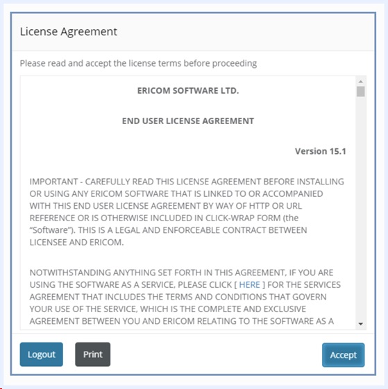 管理コンソールを初めて開くと、使用許諾契約(EULA)が表示されます。管理コンソールにアクセスするまえに、EULA に同意する必要があります。このポップアップは、同意が行われるまで表示され続けます。