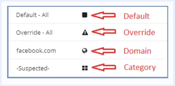 特定のエントリがドメイン/IPアドレスまたはカテゴリを表すかどうかを識別するには、タイプアイコンを確認します。