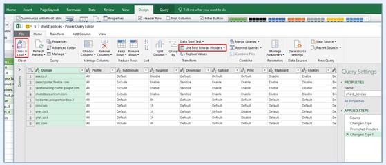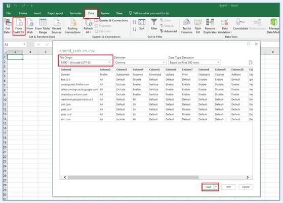 「エクスポート」オプション(上部バーの右側)を選択します。CSV ファイルがローカルにダウンロードされます。このファイルには、管理コンソールのポリシーテーブルと同じ列とエントリが含まれています。ファイル内のすべての値(列名、ポリシー値)は英語表記されます。ドメイン名やコメントが他の言語(日本語など)の場合、CSVファイル形式で出力すると文字が変わる可能性があります。
