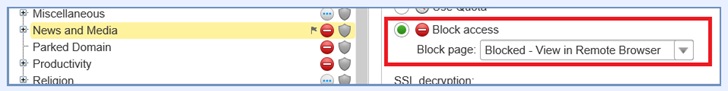 ブラウザ分離を使用できるようカテゴリを設定するには、「Web| Policies | Web Categories」(Web | ポリシー | Web カテゴリ)に移動します。カテゴリのアクションを「Block access」(アクセスをブロックする)に設定してから、分離を使用するブロックページを選択します。デフォルトでは、このオプションには「Blocked – View in Remote Browser」(ブロック - リモートブラウザで表示)というラベルが付いています。