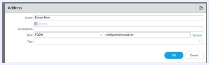 IP アドレスフィールドに Ericom Shield のアドレス <shield.ericomcloud.net> を入力します。