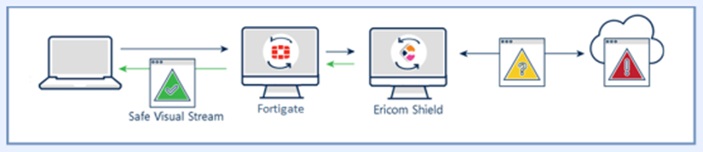 FortiGateのブロックページは、ブロックされたURLをEricom Shieldの分離で起動するためのリンクを提供するように設定することができます。このオプションは、Web転送サーバーが利用できないFortiGateの「Transparent Web」モードで使用されます。