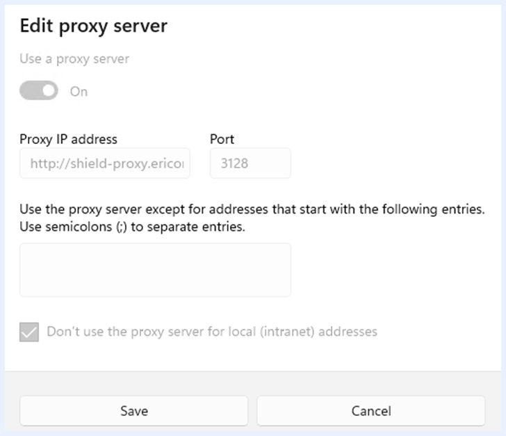 ※ SAML認証している場合、Shield CloudはユーザーのSAML認証のために「shield.ericomcloud.net」を経由してSAML認証サイトへ遷移します。そのため、「プロキシーなしで接続」には、「shield.ericomclooud.net」を設定する必要があります。