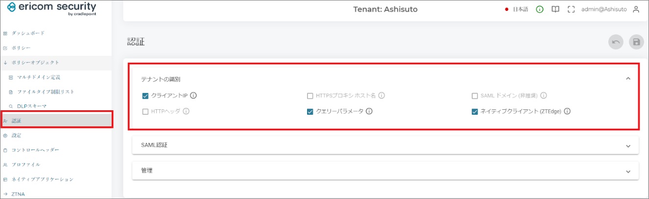 現在のお客様のテナント識別方法の確認は、後述の「 5.8.3. テナント識別設定について 」に記載のShield Cloud管理コンソール上からご確認いただけます。