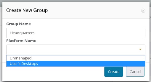 プラットフォームを追加すると、「マネージド」システム・グループを作成することが可能になります。 マネージドのシステム・グループは VDI プールと同様、特定のホストまたはホストのグループへユーザを割り当てるための手段を提供します。また、プラットフォーム・レベルからマシンを管理する機能を提供します。 例えば、慎重に扱うべき HR アプリケーションをホストする仮想デスクトップを「HR」システム・グループに追加できます。その後、HR システム・グループを「HR デスクトップ」公開グループのみに割り当てます。 「HR デスクトップ」公開グループのメンバーであるユーザのみが、ログイン時に HR 固有のデスクトップにアクセスできるようになります。 ベストプラクティスとして、偶然その中に含まれたシステムにユーザが接続できないことを確実にするために、「すべてのホスト」グループを無効化することをお勧めします。 新しいシステム・グループを作成する場合は、「Platform Name」オプションを選択し、グループに関連付ける任意のプラットフォームを選択します。