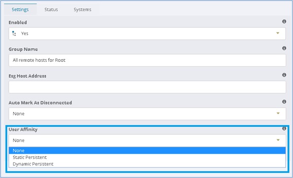 ユーザ・アファニティ: このグループにおいてユーザをどのようにホストに割り当てるかを設定します: 静的永続または動的永続。 この設定を有効化して使用する場合、すべてのシステムが 1つだけのシステム・グループに存在することを確認するのをお勧めします。 システムを永続的に割り当て、複数のシステム・グループに存在する場合、ユーザがシステムに到達できない状況が発生する可能性があります。