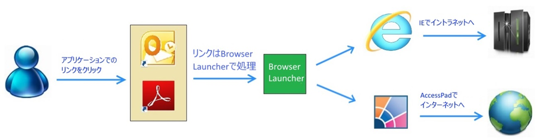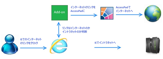 ユーザーがイントラネットのブラウザーからインターネットのリンクをクリックするケースです。 その場合、KOTOMINEの一部であるアドオン・拡張がクリックされたリンクをAccessPadで開きます。