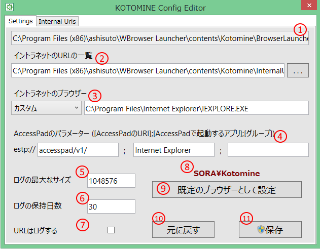 - ⑧ Config Editorを起動しているユーザーのログイン名です。KOTOMINEを既定のブラウザーとして設定する際、必要な変更はこのユーザーのアカウントに適用します。