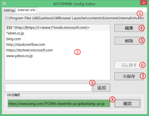 - ① 編集中のイントラネットのURLの一覧のファイルのパスです。