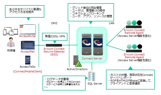 Ericom Connect は、世界で初めてグリッドアーキテクチャをコネクションブローカーに採用し、 10 万ユーザ規模のクライアント仮想化環境もシンプルな構成で実現する無限のスケーラビリティ を備えた革新的なアクセスソリューションです。エンタープライズレベルのスケーラビリティと 高い管理性を求める企業、デスクトップやアプリケーションをサービス提供するクラウドプロバイダー、 限られた IT リソースでマルチデバイス環境に業務アプリケーションを提供したい企業にとって最適な製品です。