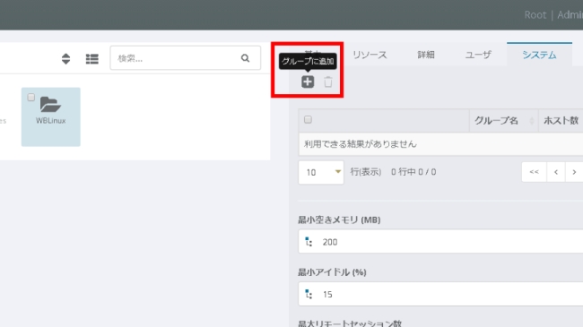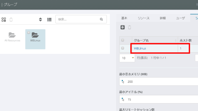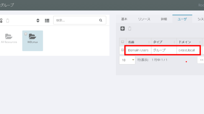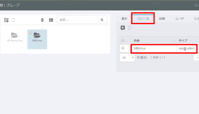 真ん中のプライマリパネルに、先ほど追加したグループが存在することを確認し、右側の詳細パネルより、[リソース] タブを選択します。