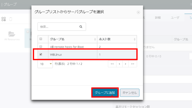 追加対象のサーバグループを選択して、チェックボタンを有効にし、[グループに追加] ボタンをクリックします。
