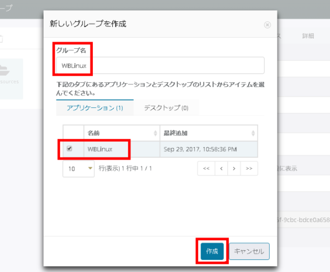 新規グループ名を入力し、[アプリケーション] タブから追加したいアプリケーションのチェックボックスを有効にし、[作成]ボタンをクリックします。
