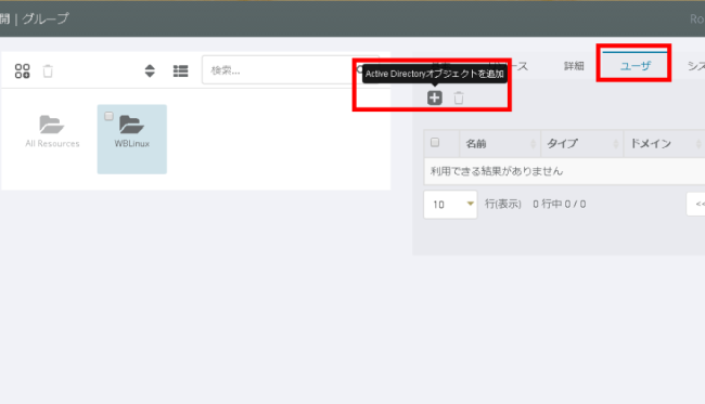 続いてユーザの紐付けを行うために、[ユーザ] タブをクリックして、[Active Directoryオブジェクトを追加] をクリックします。