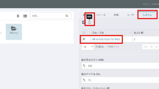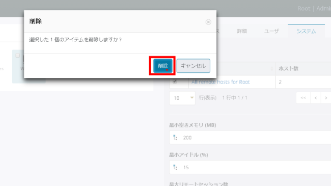まずはデフォルト設定を削除するために[All remote hosts for Root]にチェックを入れて、[削除]をクリックします。