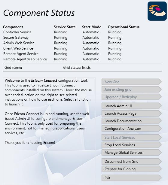 グリッドは「グリッド名」によって識別されます。すべてのコンポーネントは特定のグリッド名で登録されます。 同一ネットワーク上の各グリッドは、一意の名前を与えられる必要があります。デフォルトの名前は「EricomConnect」です。 グリッドのメンバーには、以下が含まれます: