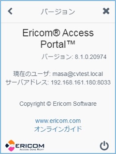 「バージョン(About)」オプションを選択すると、バージョン番号と Ericom Connect オンライン・ガイドと Web サイトへのリンクが記載されたダイアログが開きます。