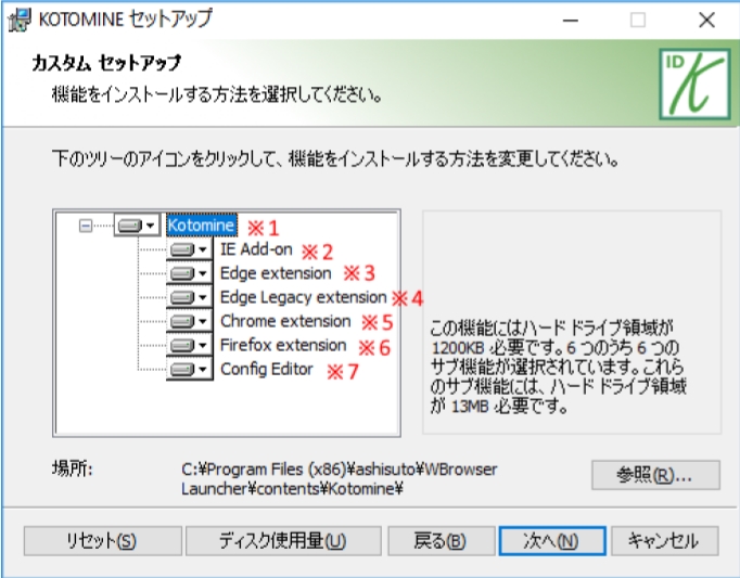 ① ツリーではインストールが必要な機能を選択できます。