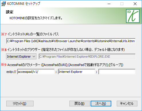 イントラネットのURLを開くためのブラウザーです。KOTOMINEの対応するブラウザーがインストールされた場合、コンボボックスから選べます。指定されたファイルが存在しない場合、デフォルト値(IE)になります。 KOTOMINEはイントラネットのブラウザーを「"C:\Program Files\Internet Explorer\iexplore.exe" http://www.idnet.co.jp」、又は「microsoft-edge:http://www.idnet.co.jp」という形式で呼び出します。設定されたブラウザーに対応する起動方法がない場合、イントラネットURLは開かない可能性があります。